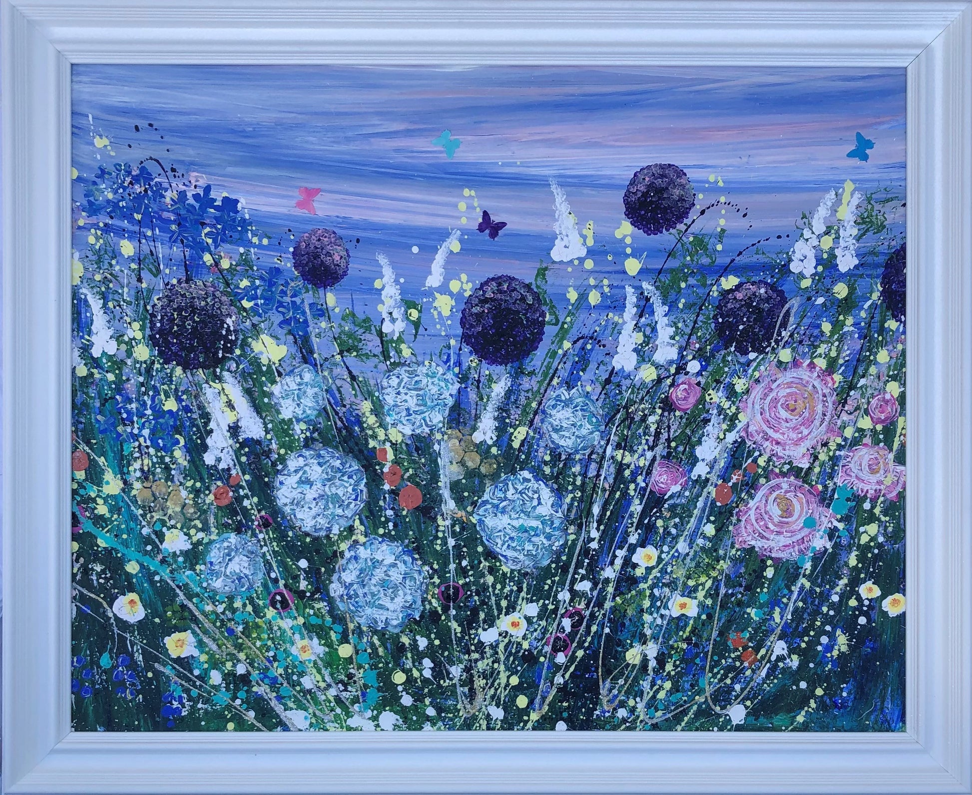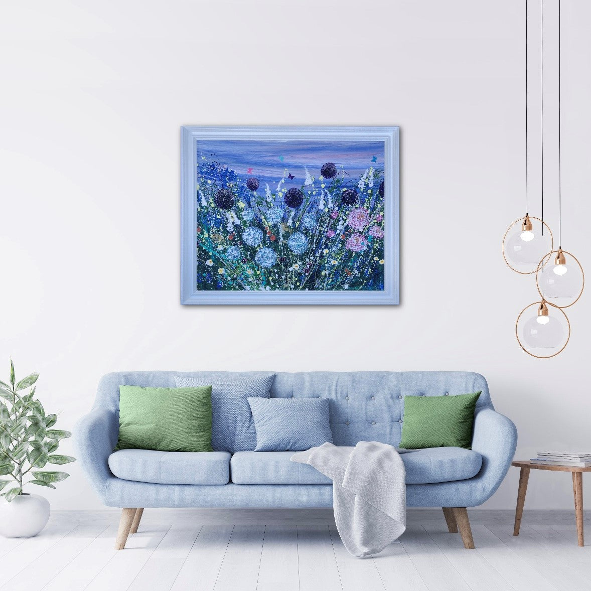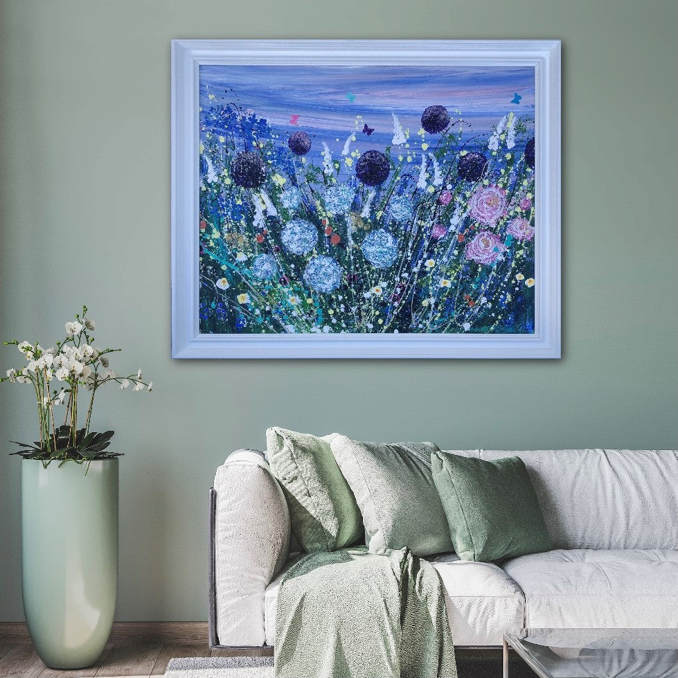 Tracey says, "Nestled into a quality, moulded, white frame sits Cream of The Crop. A celebration of come of the biggest and most striking county garden flowers adorning quintessentially British gardens. Alliums, hydrangeas and peonies take centre stage as the stars of this particular show, but it is the overall feeling of abundance and burst of joy, life and hope that make this piece truly uplifting and glorious. a wonderful statement piece with blues, pinks and purples as predominant colours but with accents of copper. pale yellow and blue green grasses. Bringing the beauty of the outside in."