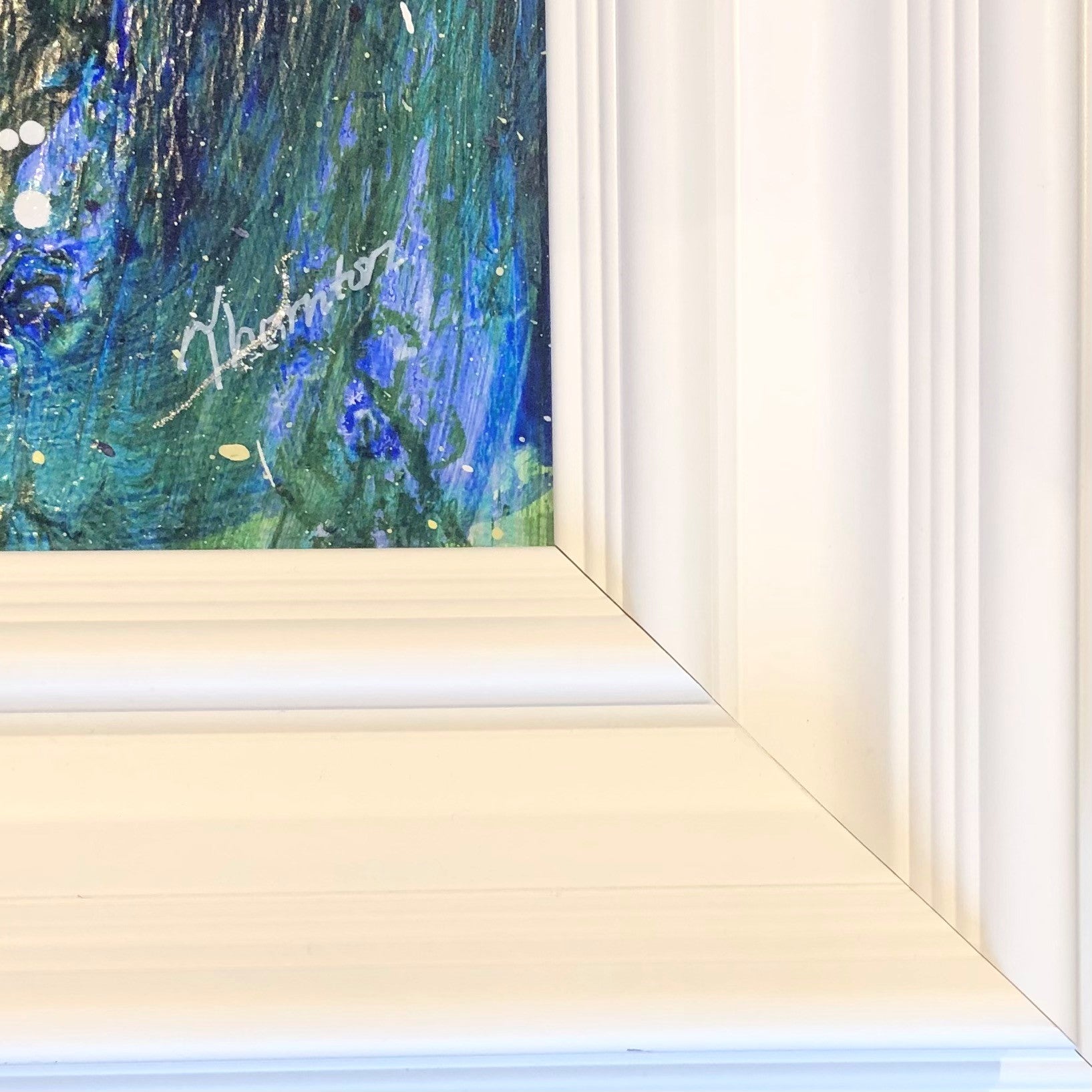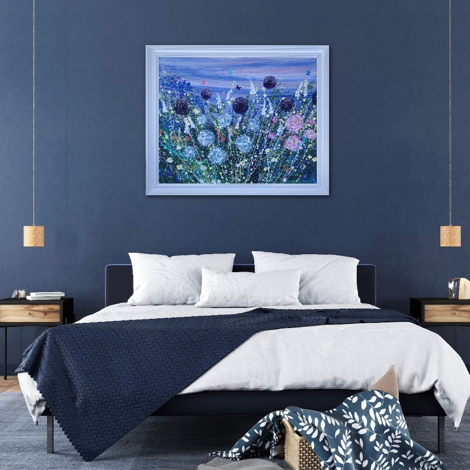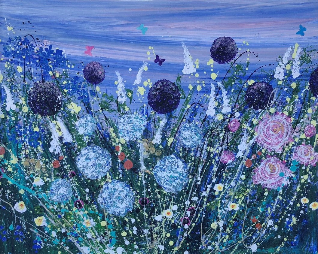 Tracey says, "Nestled into a quality, moulded, white frame sits Cream of The Crop. A celebration of come of the biggest and most striking county garden flowers adorning quintessentially British gardens. Alliums, hydrangeas and peonies take centre stage as the stars of this particular show, but it is the overall feeling of abundance and burst of joy, life and hope that make this piece truly uplifting and glorious. a wonderful statement piece with blues, pinks and purples as predominant colours but with accents of copper. pale yellow and blue green grasses. Bringing the beauty of the outside in."