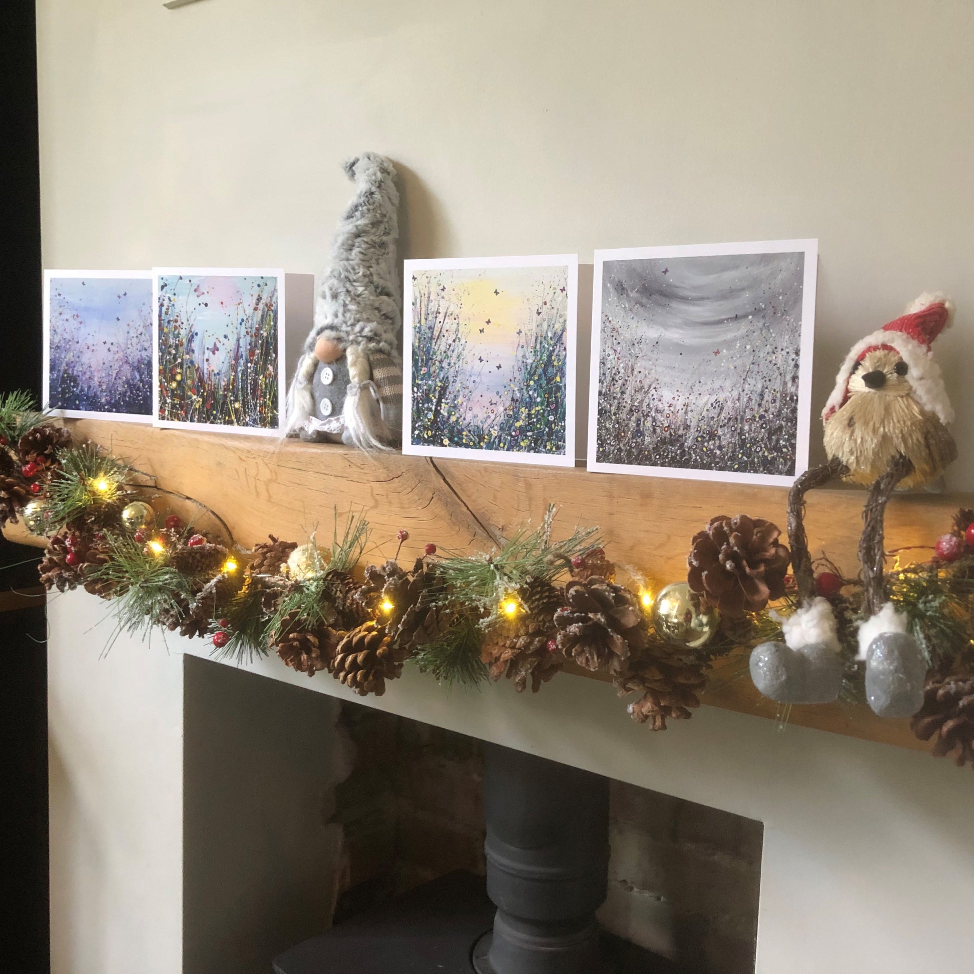 In a set of 4 Cards: Blue Hue, Four Seasons Winter, Morning Dew, Out Of Darkness.